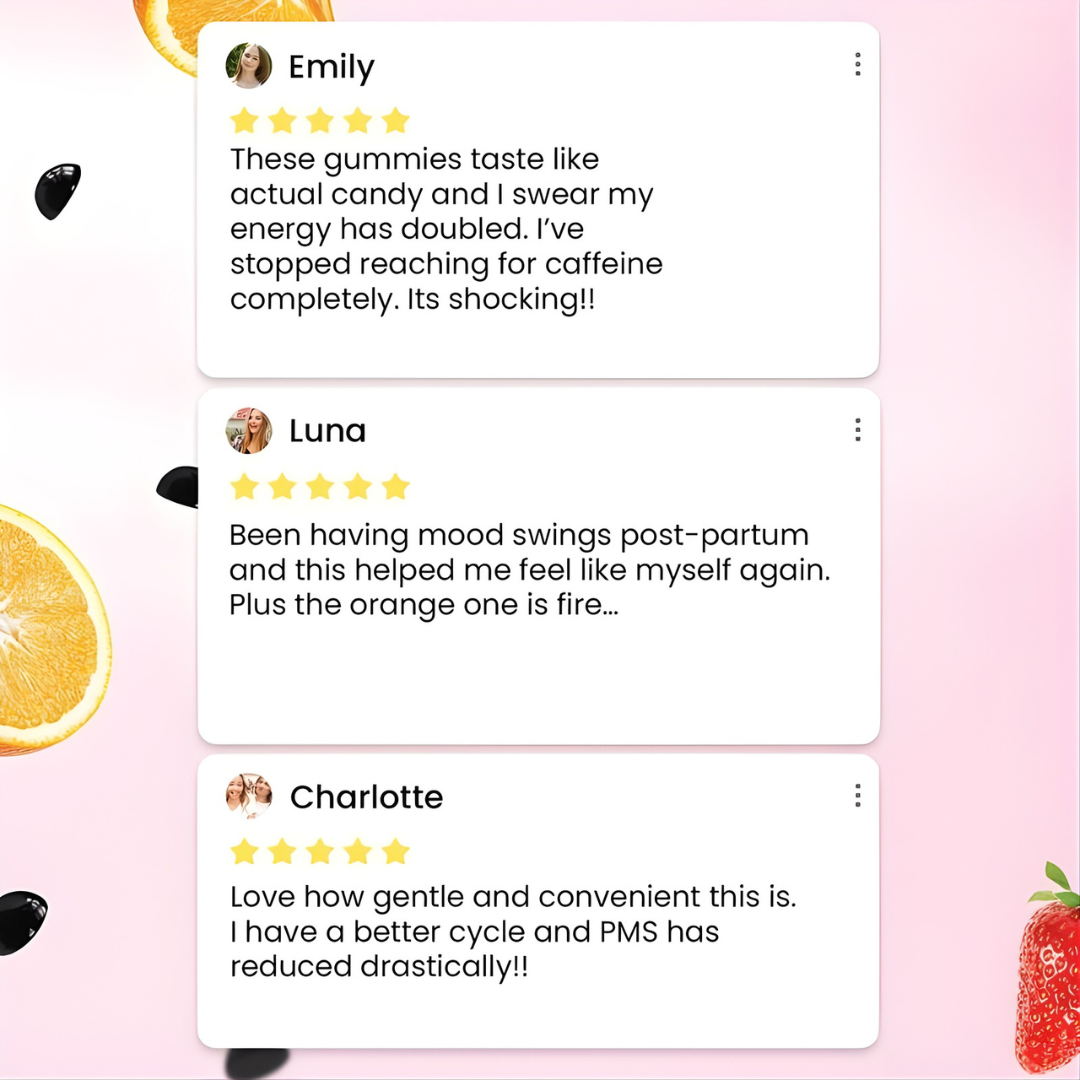 “My hormones were all over the place — mood swings, fatigue, zero motivation. These gummies helped me feel centered and calm again. I’m finally in control of my body and emotions.”
